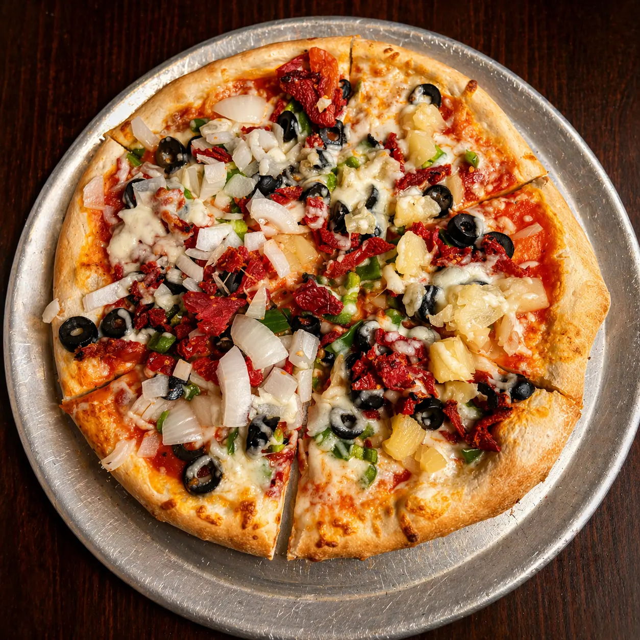 Pepperoni, Italian sausage, beef, artichokes, olives, peppers, onion, mushrooms, and diced tomato. A whole pie's worth of toppings.