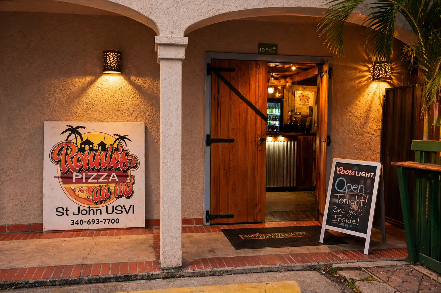Skip the drive into town. Ronnie's delivers fresh pies, calzones, wings, and cold drinks across the Cruz Bay area, nightly from 6:30pm to 8:30pm. $20 minimum.